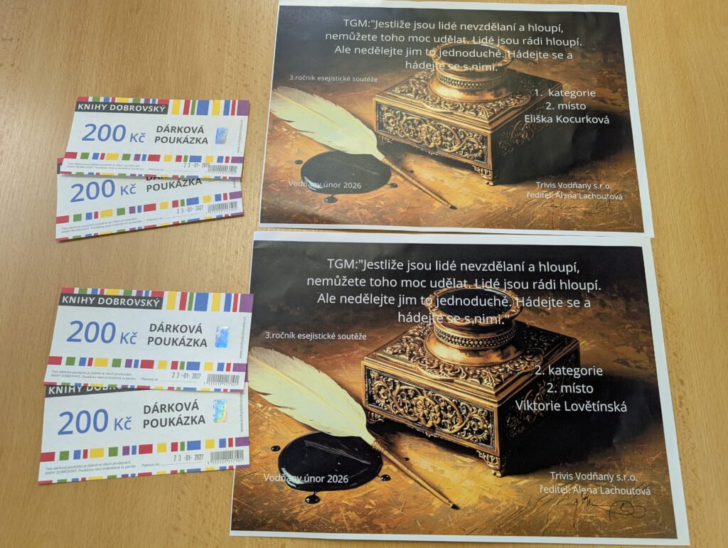 Naše žákyně Eliška Kocurková (ZOB2) a Viktorie Lovětínská (ZOB3) uspěly v literární soutěži, kterou organizovala škola TRIVIS Vodňany. Obě obsadily 2. místo, každá ve své kategorii. Ve svých esejích se zabývaly otázkou, proč společnost potřebuje vzdělané a přemýšlivé lidi.