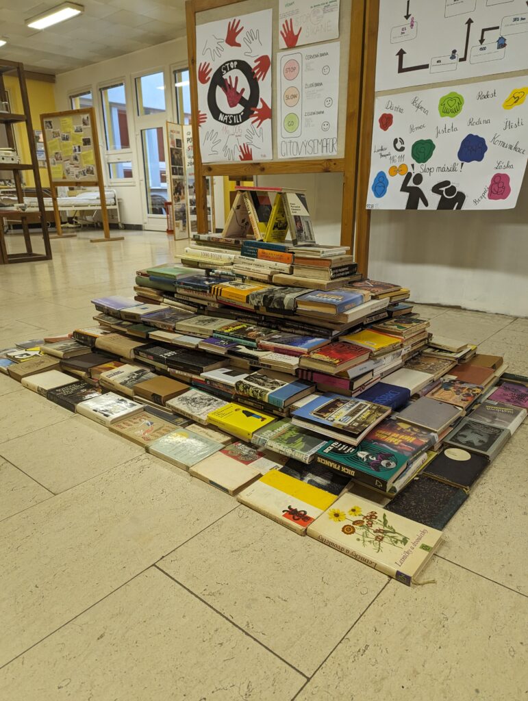 Měsíc říjen byl na naší škole věnován knihám a čtení. Tomuto tématu byla přizpůsobena výzdoba části školy – postavili jsme pyramidu z knih a vytvořili nástěnku se známými i méně známými citáty o knihách.